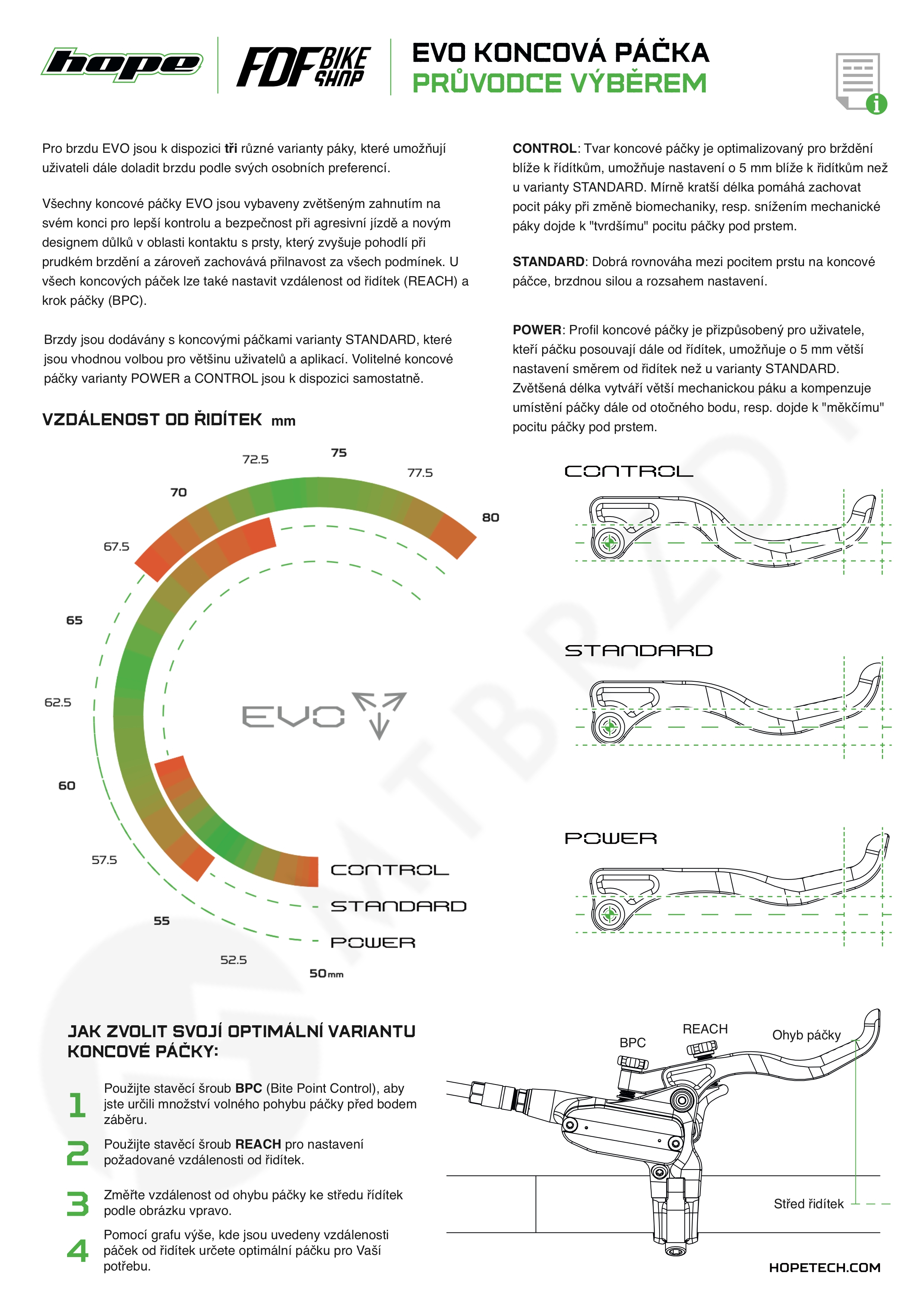 U brzdové páky HOPE Tech 4 EVO je nyní možné vyměnit koncovou páčku za jinou variantu. Běžně je páka HOPE Tech 4 EVO dodávána s koncovou páčkou ve variantě STANDARD, tj. nejvhodnějším typem pro většinu jezdců, rukou, stylů jízdy a dávkování výkonu. Tento model je ale možné vyměnit např. za delší variantu POWER nebo naopak kratší model CONTROL. Tyto páčky je možné zakoupit samostatně a jejich rozdíly uvádíme níže.
