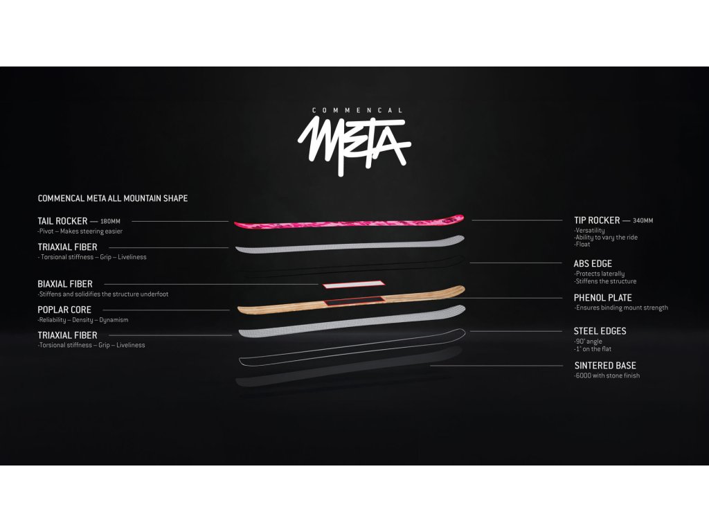 Konstrukce je navržena tak, aby zaručovala výkon. S ohledem na to jsme změnili výztuhy na topolovém jádru přidáním triaxiálního vlákna, což přináší skvělý výsledek s větší přilnavostí a živostí například při dokončování zatáčky. V konečném důsledku všestranné, neudělali jsme žádné kompromisy ohledně vize, kterou jsme měli pro tyto lyže META.