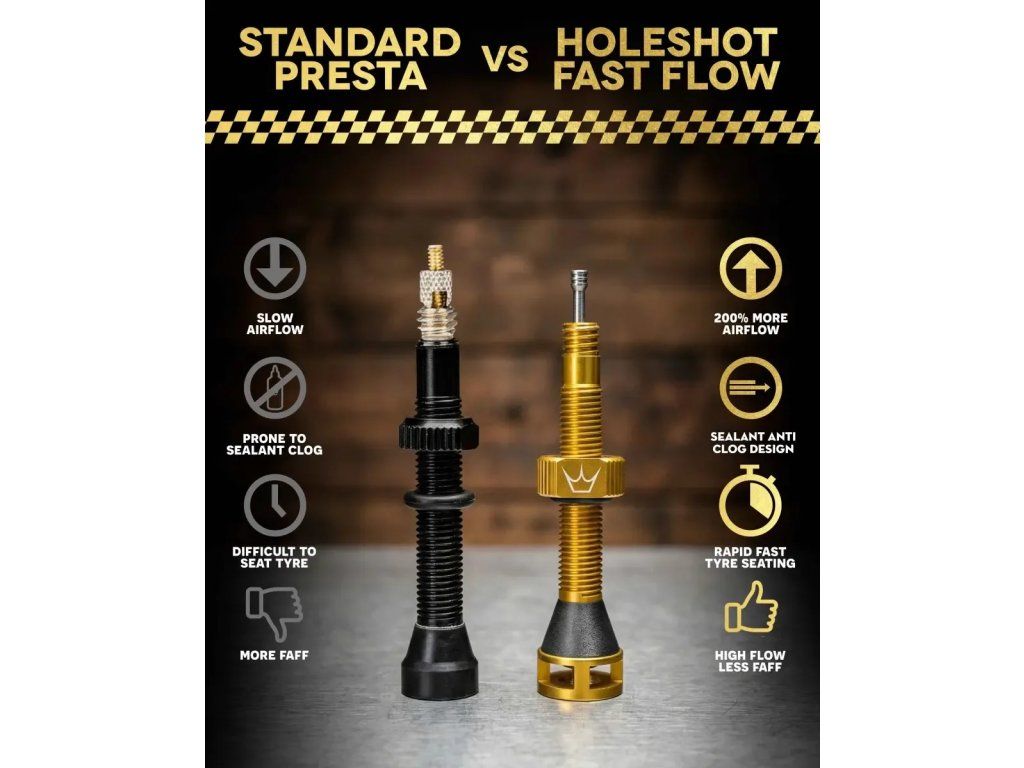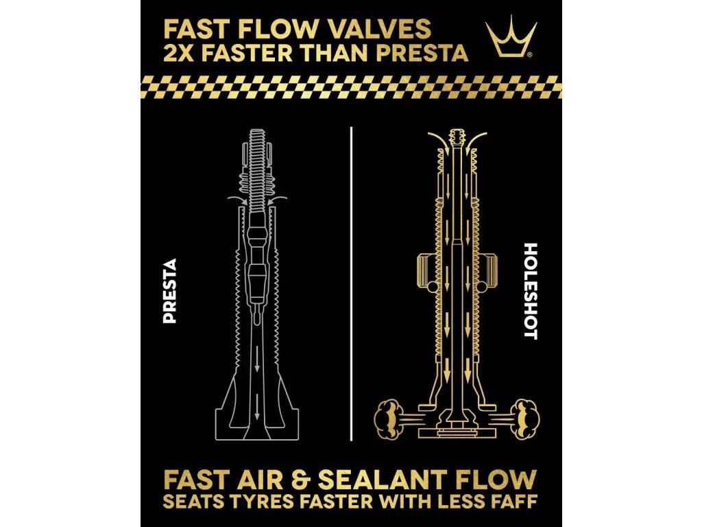 Při testování poskytují ventily Holeshot Fast Flow přibližně o 200 % větší průtok vzduchu než naše ventilky Presta Mk2, přičemž zachovávají vzduchotěsný, bezpečný design, který snižuje riziko poškození během používání.